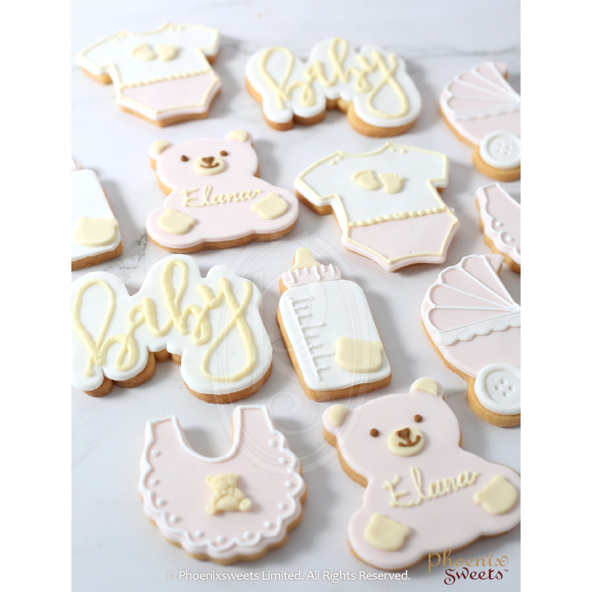 You can choose baby blue or pink, we can put the baby's English name on the bear cookies.