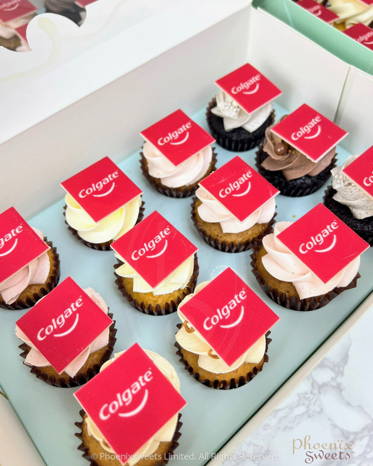 The excellent choice for corporate and branding events, we can make the customised logo on edible sugar plates to be put on our renowned delicious cupcakes and mini cupcakes.